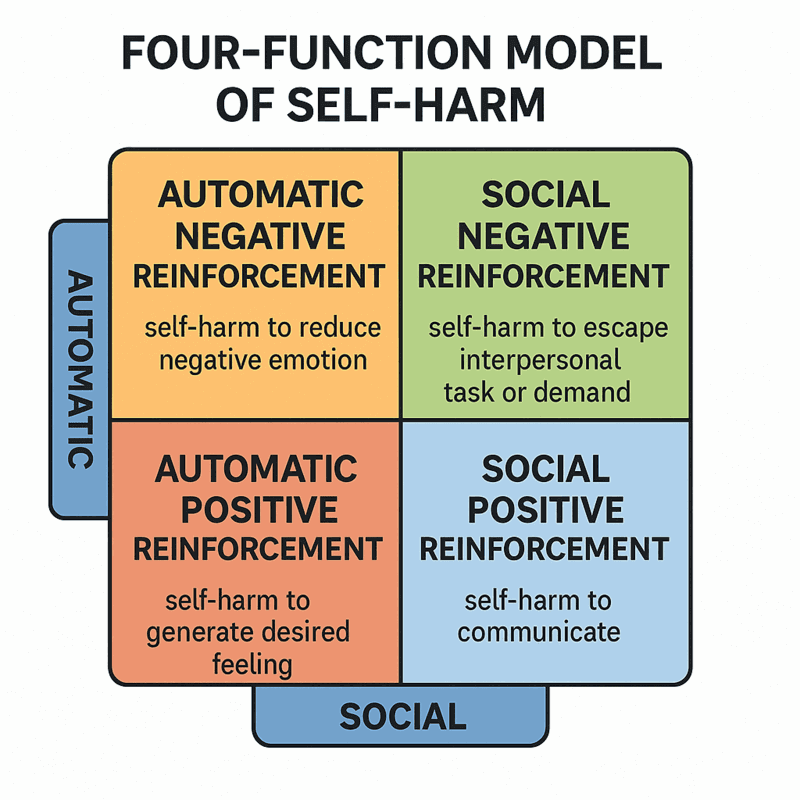 Two complementary lines of evidence shape contemporary understanding of why people self-injure. The first is the well-validated Four-Function Model (FFM – see figure below: Four Function Model of Self-Harm), which proposes that NSSI is maintained by reinforcement processes operating at two levels – automatic (intrapersonal) and social (interpersonal) – and in two directions – negative (removing something aversive) and positive (adding something desired).